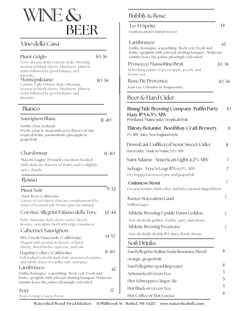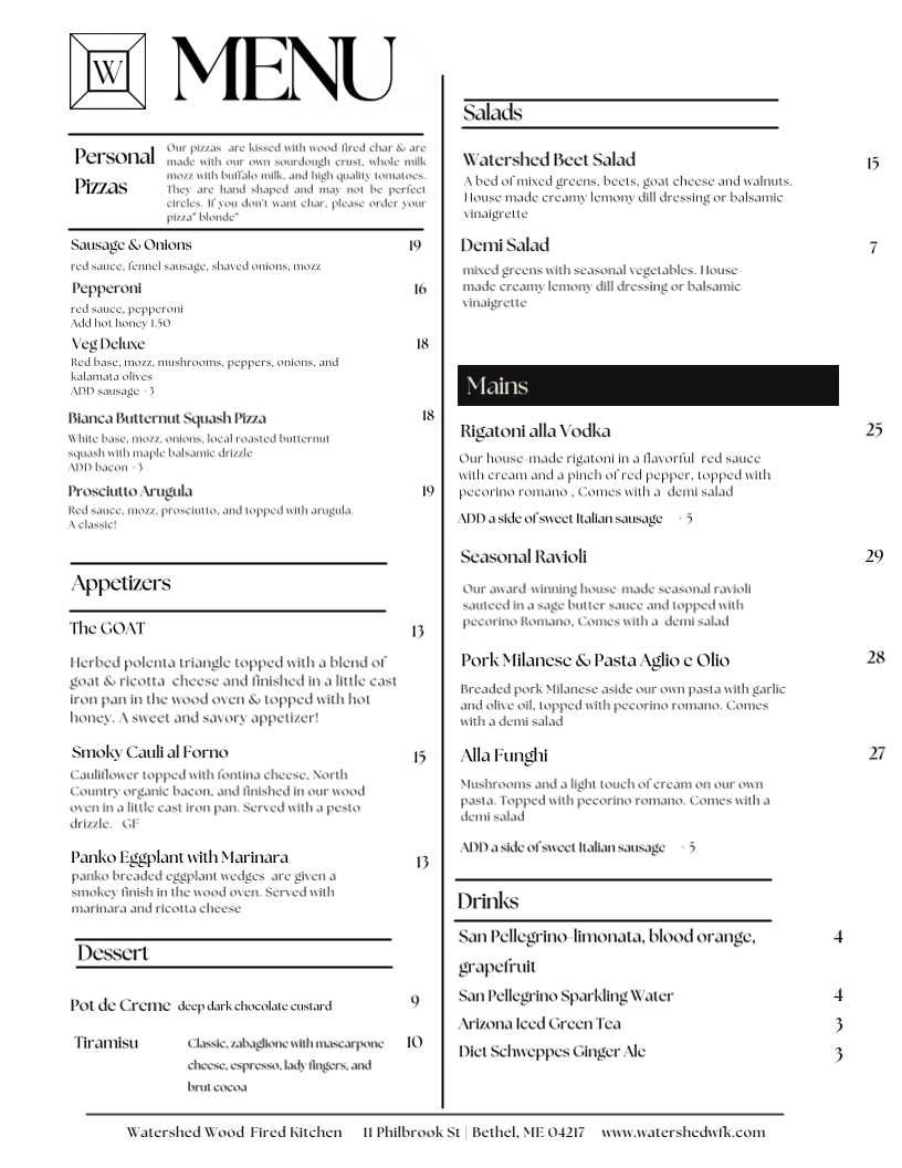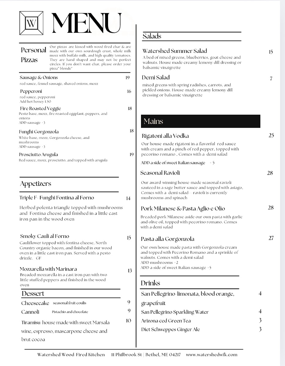 Watershed Wood-Fired Kitchen Menu brings together the kind of dishes you crave after a day exploring Bethel, and it does so with plenty of character. Tucked away at 11 Philbrook St in Maine’s mountain country, this spot leans into bold flavors and a cozy, wood-fired style that gives even familiar favorites a little extra charm. As you look through the menu, you’ll notice how the smoky aroma carries through everything from hearty entrées to the shareable bites that are perfect for easing into the evening.